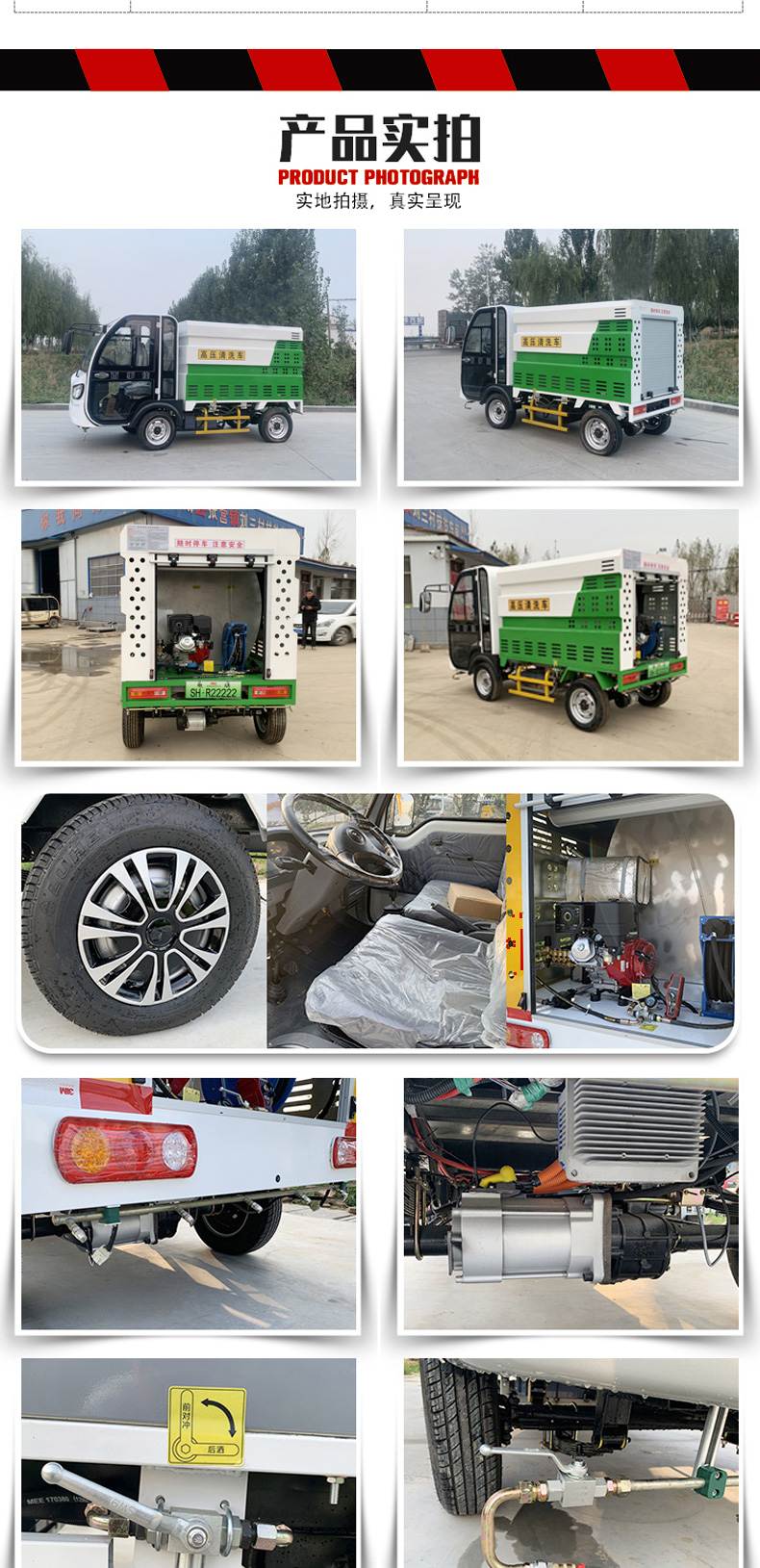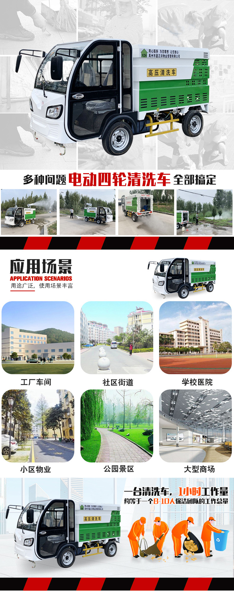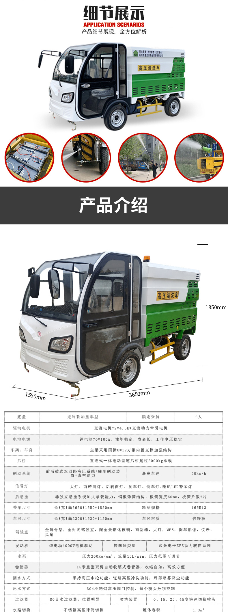 - 高端清洗車,主要用于城市人行道、輔道、路沿石的快速沖洗和保潔,以及城市小廣告清 理、果皮箱和垃圾桶沖洗、地面污垢去除、地磚還原本色、公交站牌沖刷、公共廁所沖洗等。 對人行道和輔道進行快速保潔。車輛體積小巧,重量輕,通過性強,且不會對人行道地磚,井 蓋等其他公共設施造成損壞。采用優質加重型電動四輪車底盤操作簡單,載重性好,通過性 強,普通環衛工人即可操作。