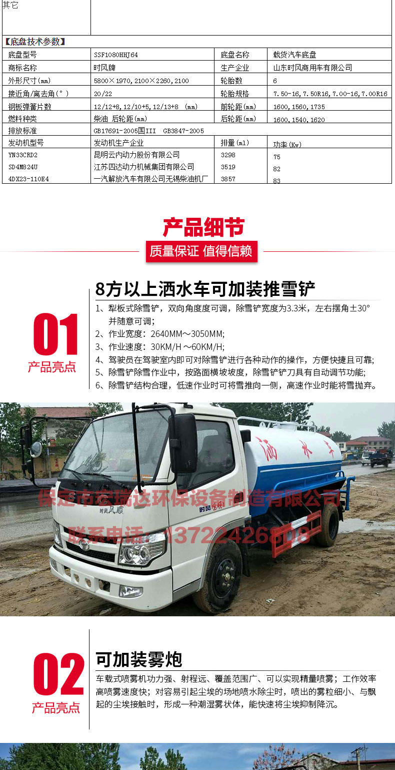 - 灑水車適合于各種路面沖洗,樹木、綠化帶、草坪綠化,道路、廠礦企業施工建設,高空建筑沖洗。具有灑水、壓塵、高、低位噴灑,農藥噴灑、護欄沖洗等功能,還具有運水、排水,應急消防。