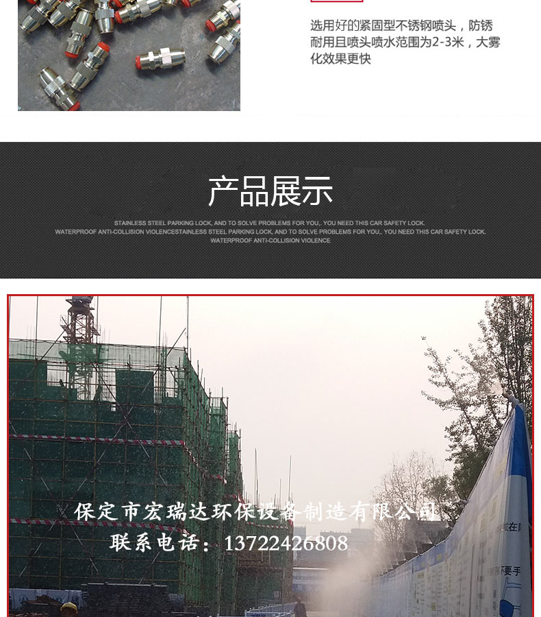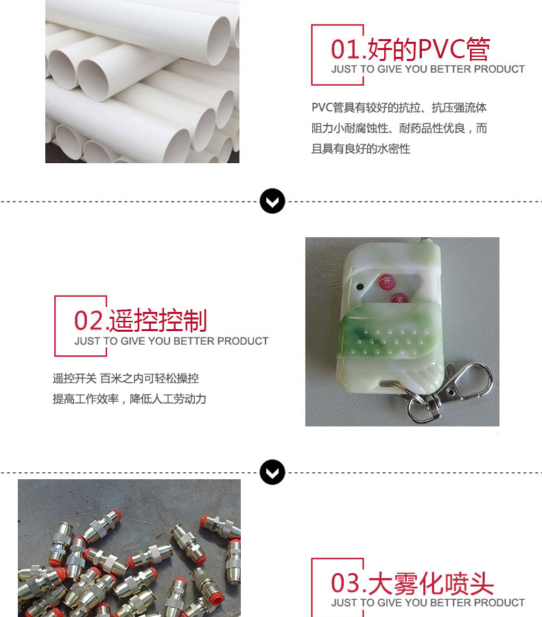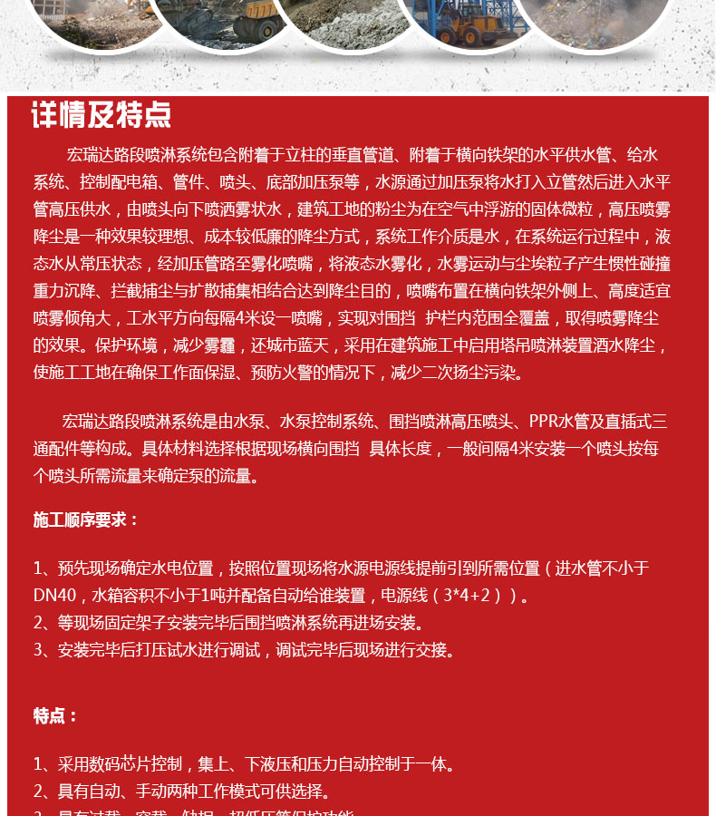 - 路段噴淋系統的構成是由PPR水管、直通、三通、彎頭等組成水流通的管路,水箱提供噴淋水源,多級泵給予輸送動力,智能控制器控制整個系統。