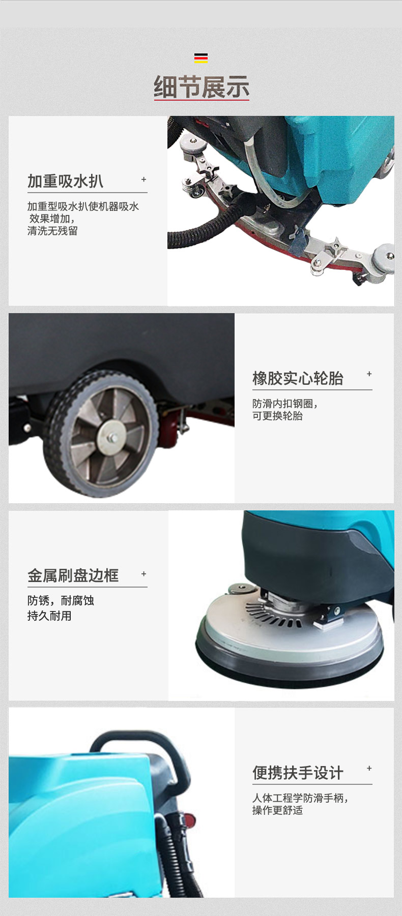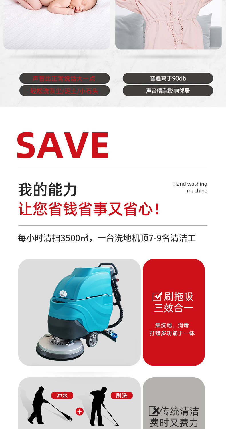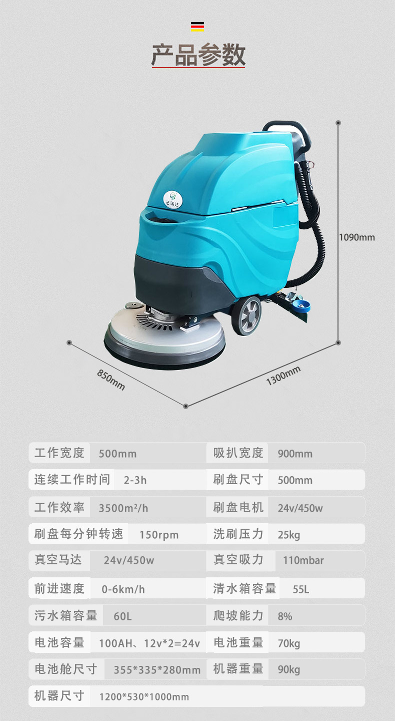 - 手推式洗地機洗地、吸干同步完成,同時將污水及其他污染源帶離現場,它的效率是人工清潔的15倍以上,人性化的設計,符合使用習慣,一鍵式操控,全自動清洗,操作人員僅需手推把握方向即可,無需具備專業知識即可輕松掌握,讓我們邁向智能化清潔之路變得簡單、可行,采用低噪音設計,將機器工作的負面影響降到最低,讓您白天、晚上都可安心工作,在收獲潔凈環境的同時,樹立起良好的工作形象,電池供電,讓它能夠自由無障礙行走,推到哪洗到哪,輕松自由