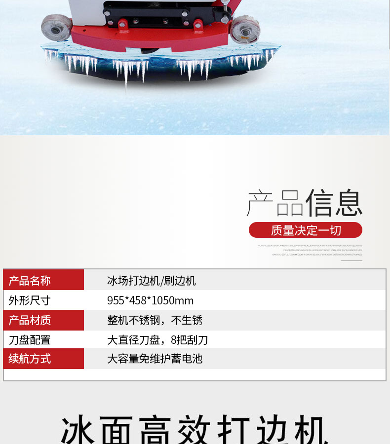 - 宏瑞達鏟(澆)冰車是一種冰面修整設備,采用推鏟、滾刮、清渣、灑水的組合方式,及時地處理由各種原因造成的凹凸不平的冰面,迅速、高效的將損傷的冰面變成專業水準的冰場 該設備適用于各種冰場的維護和日常保養。